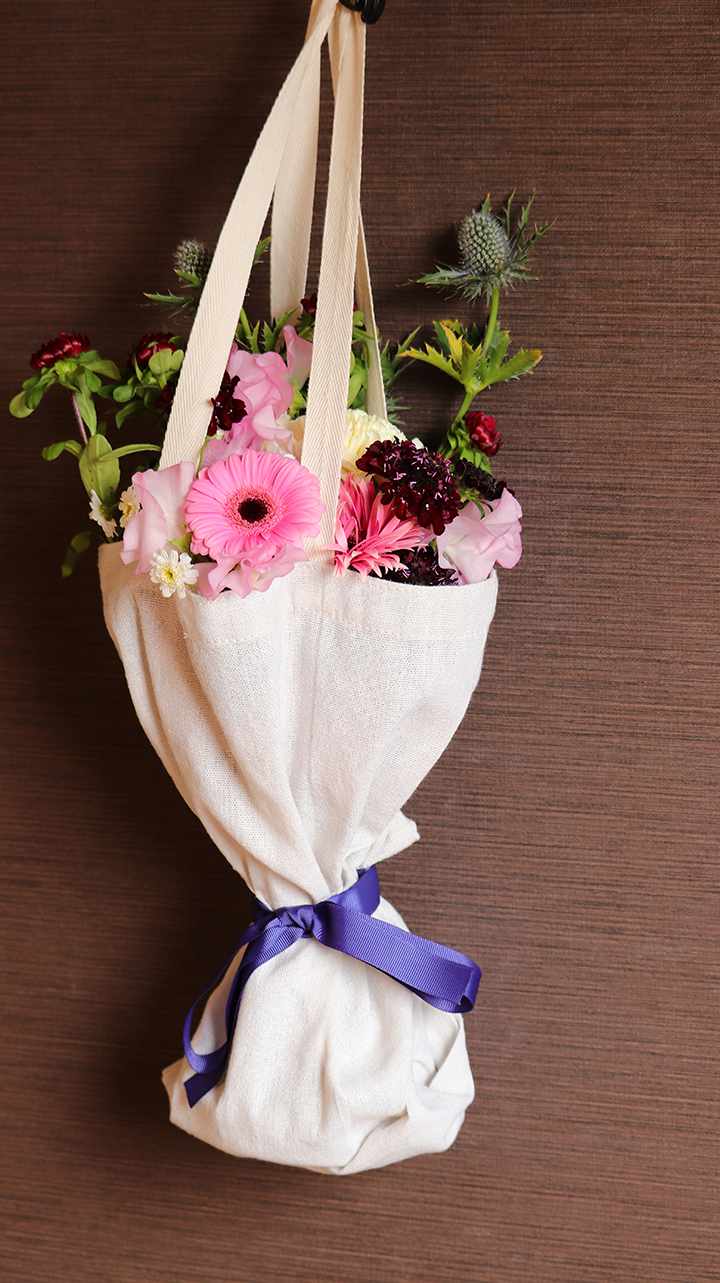 スタンディングブーケ用にボタンで丈を調整でき、花束用のエコバックとしても利用可能。プレゼント後も、お母さんが切り花や日用品を買う際のエコバックとしても二次利用できます。環境にやさしいサステナブル商品です。